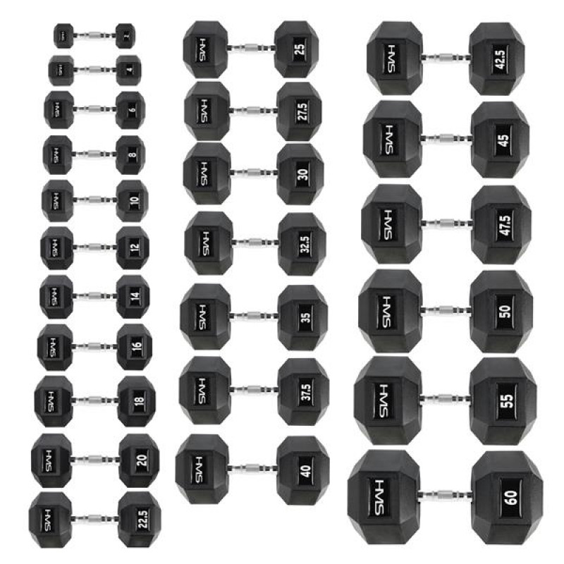 HEX PRO HMS - прогумована шестикутна гантель. Тренування з гантелями сімейства HEX PRO HMS дозволяє повторювати практично всі види вправ зі штангою. У той же час, це дозволяє виконувати асиметричну роботу з використанням тільки однієї руки. Прогумовані гантелі ударостійкі та мають ергономічну форму. Рифлена ручка забезпечує надійний хват.