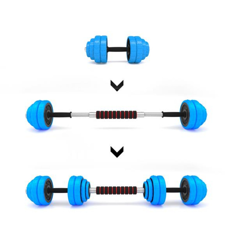 Завдяки спеціальному подовженню можна з'єднати дві короткі планки в одну довгу. Це інноваційне рішення значно розширює спектр можливостей. Користувач може мати штангу для виконання вправ, які неможливі або незручні під час використання гантелей. Маючи один продукт, ми можемо використовувати два.