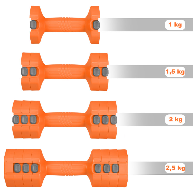 - Регулювання ваги 4-в-1 на кожній гантелі: 1 / 1,5 / 2 / 2,5 кг - встановлюйте навантаження для кожного вправи.
