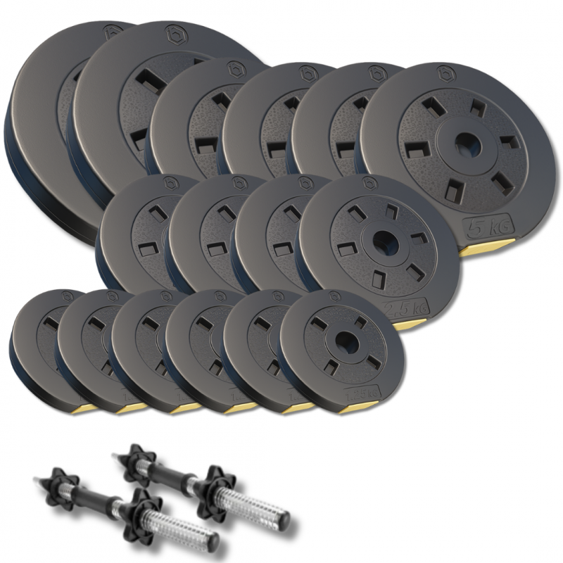 Набір композитних дисків Besport PowerPro 59кг для гантелей та штанг + 2 грифа - ідеальний вибір для домашнього спортивного куточку, де важлива універсальність, надійність та поступове зростання навантаження. У комплект входять диски чотирьох різних вагових категорій (від 1,25 до 10кг) та два гантельні грифи довжиною 45см, що дозволяє легко змінювати рівень навантаження, тренуючи всі основні групи м'язів. Завдяки сумарній вазі у 59кг, ви зможете використовувати цей набір і для силових тренувань, і для функціональних програм - без обмежень.