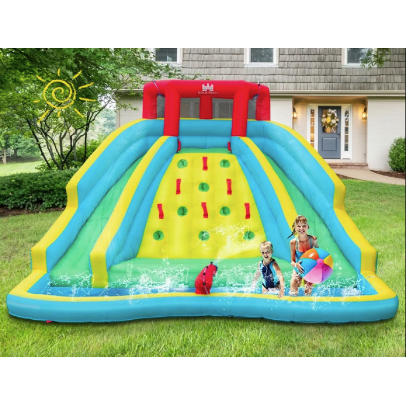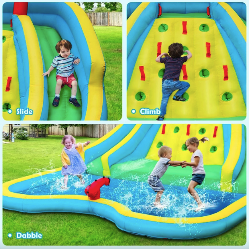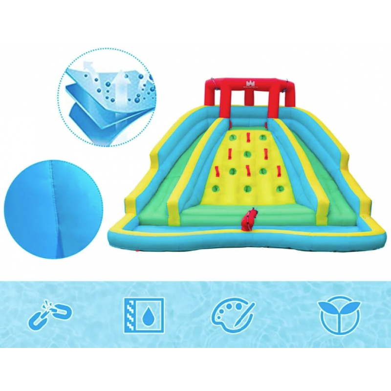 Уявіть собі ранок, коли діти прокидаються з нетерпінням, бо знають: сьогодні знову буде день сміху, бризок і шалених гірок. Ваш двір стає ареною дитячих перемог і пригод із новим надувним аквапарком 2-вигнуті гірки + басейн + скелелазіння. Цей фантастичний парк наповнений можливостями для веселощів: водяні гірки, стіна для підйому, водяна гармата та гігантський басейн - усе, що потрібно для ідеального дитячого свята. Неймовірні вигини гірок, освіжаючий фонтан з розпилювачів, активне лазіння й водяні бої зроблять кожен день незабутнім. А міцна тканина Oxford 420D та 840D із ПВХ-покриттям витримує щоденне використання, навіть у найенергійніших малюків. Безпека гарантована - захисна сітка, стійке кріплення й гладка поверхня без проколів. Аквапарк встановлюється за лічені хвилини, а емоції залишаються надовго.