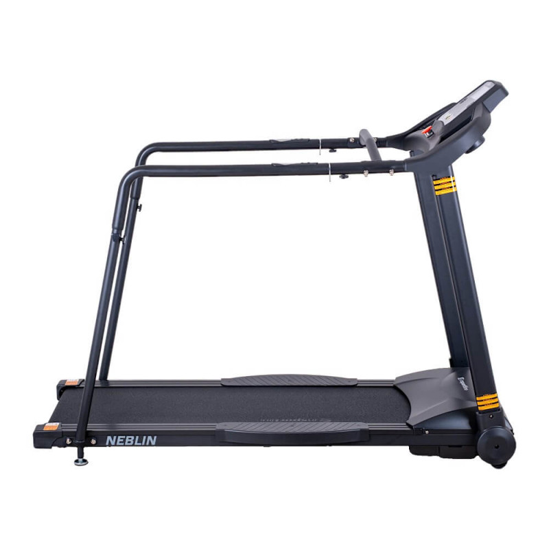 Бігова доріжка inSPORTline Neblin — це домашня бігова доріжка, призначена спеціально для реабілітації. Бічні поручні, виготовлені з м’якого матеріалу, допомагають під час ходьби по полотну бігової доріжки. Вони гарантують безпеку на кожному кроці та підтримку по всій довжині талії. Ви також знайдете інше горизонтальне поруччя прямо перед собою.