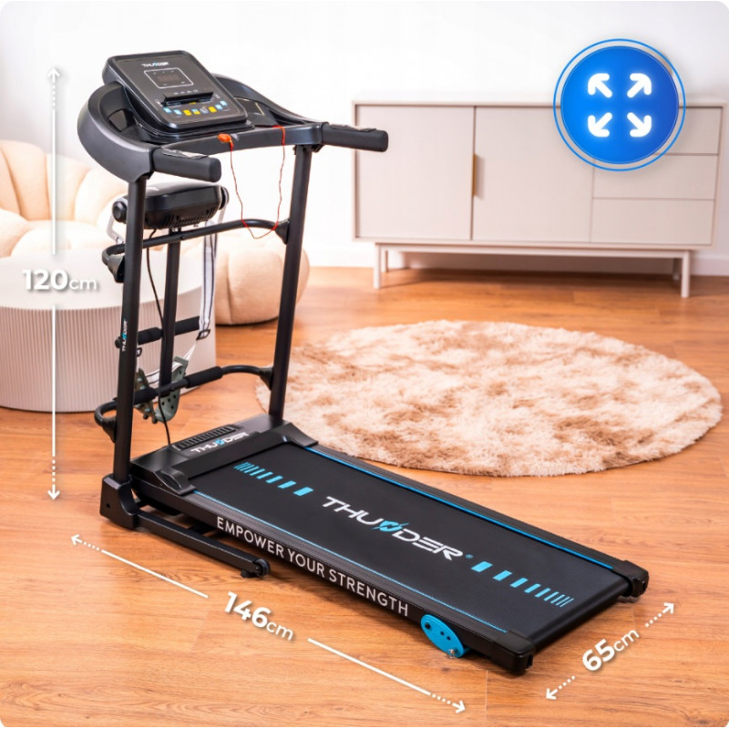- Розміри розкладеної бігової доріжки: 146 см (довжина) x 65 см (ширина) x 120 см (висота)
