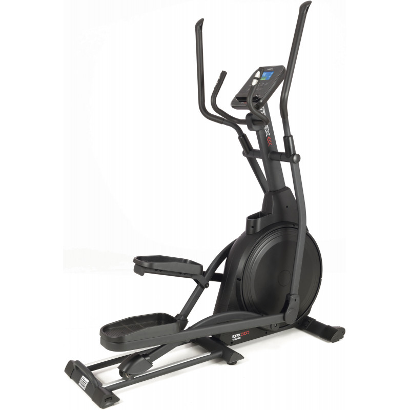 Орбітрек Toorx Elliptical ERX 550 (ERX-550) із преміальної лінійки Chrono Line італійського виробника Garlando S.p.A. призначений для інтенсивного кардіотренування в домашніх умовах. Тренажер має 24 рівні навантаження, що регулюються за допомогою сучасного комп'ютера. 16-кілограмовий маховик створює чудову плавність ходу, знижуючи навантаження на суглоби та мінімізуючи ризик отримання травми в процесі занять. Орбітрек розрахований на вагу до 130 кг, а довжина кроку 51 см припаде до вподоби навіть найвибагливішим користувачам. Вбудований приймач для бездротового датчика вимірювання пульсу буде доречним під час тренування по одній із чотирьох пульсозалежних програм. Консоль тренажера має підставку для смартфона/планшета та підтримує Bluetooth для інтеграції з популярними додатками Kinomap і Zwift, які перетворять монотонне тренування в захоплюючий процес.