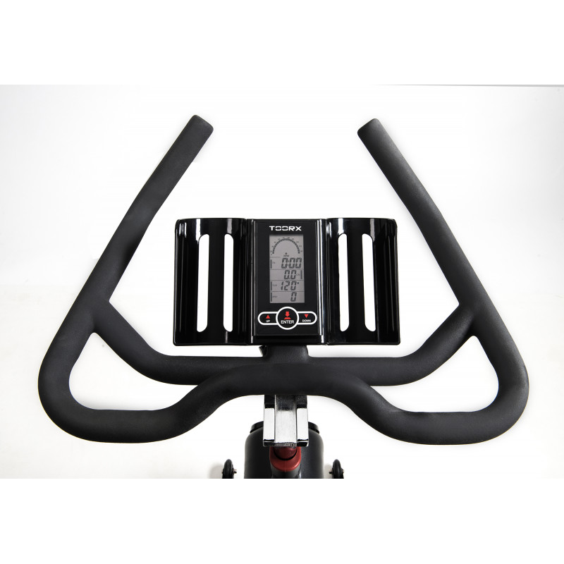 Сайкл-тренажер Toorx Indoor Cycle SRX 100 (SRX-100) із преміальної лінійки Chrono Line італійського виробника Garlando S.p.A. призначений для інтенсивного кардіотренування в домашніх умовах. Тренажер має колодкову гальмівну систему з ручним безступінчатим регулюванням навантаження, а також сучасний комп'ютер із необхідним набором функцій. Важкий 26-кілограмовий маховик разом із ремінним приводом забезпечують безшумність роботи тренажера та достатнє навантаження навіть для підготовлених спортсменів. Спін байк розрахований на вагу до 150 кг і підійде для користувачів зростом до 2 м. Нагрудний кардіодатчик для бездротового вимірювання пульсу буде доречним під час тренування для контролю частоти серцевих скорочень. Спортивне сидіння та кермо регулюються по висоті та в горизонтальній площині, забезпечуючи індивідуальне налаштування. Транспортувальні ролики в передній частині тренажера дозволяють вільно переміщати його по кімнаті.