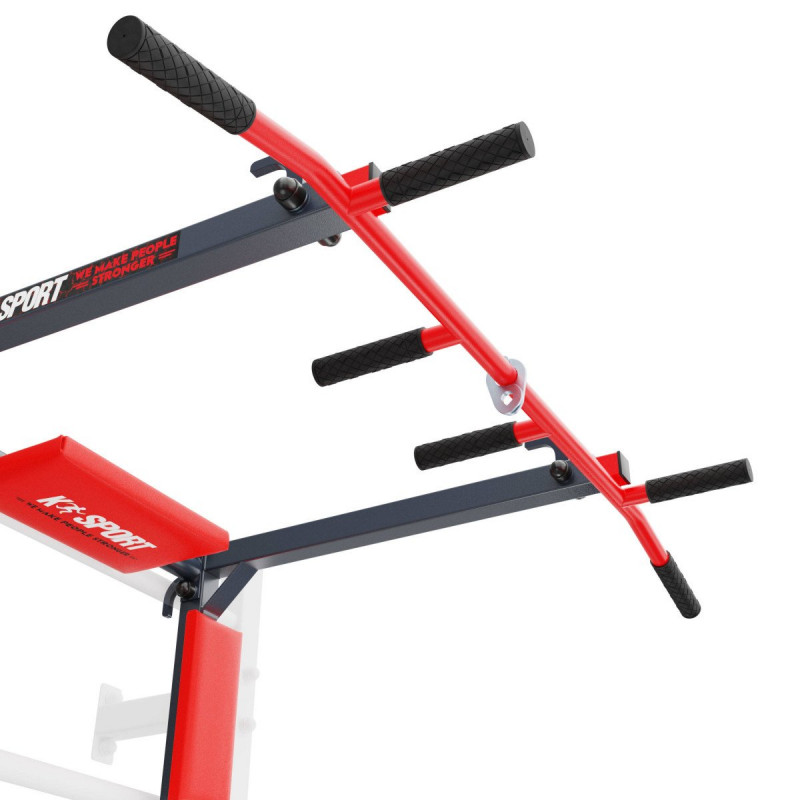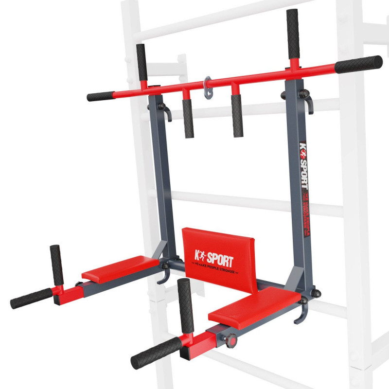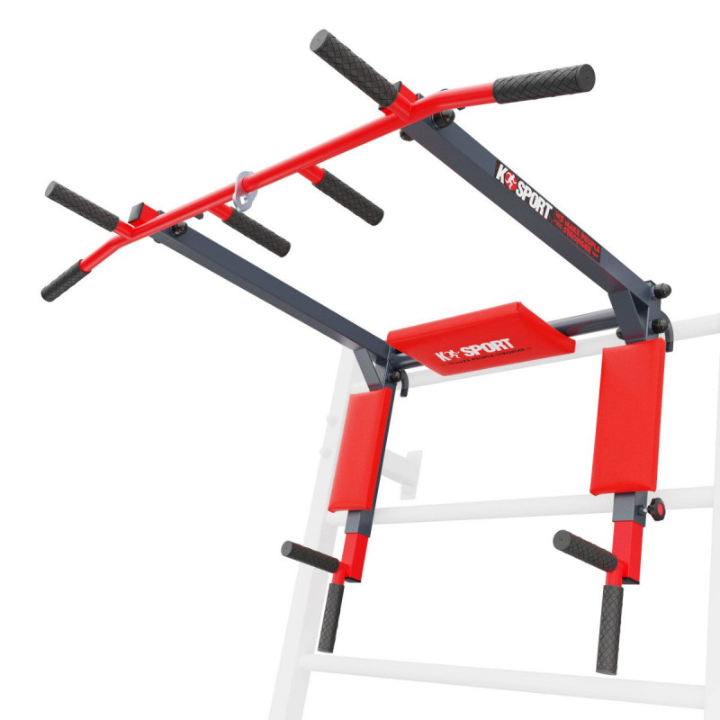Обладнання, призначене для монтажу на стіні. Він має два способи кріплення, тож ви можете використовувати його як штангу для підтягування або занурення. Безліч можливостей для професійного тренування м'язів спини і рук завдяки п'яти різним захопленням. Після повороту обладнання поручень дозволяє ретельно тренувати м’язи преса, рук і грудей.