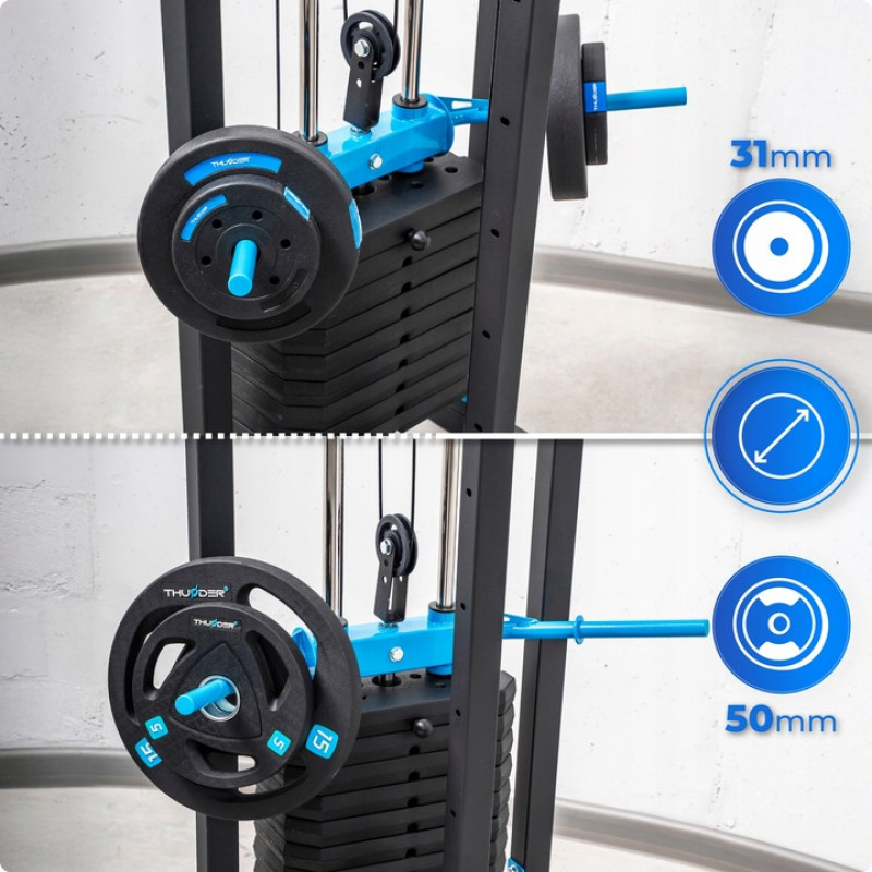 Конструкція дозволяє додавати вагу з обох боків, що збільшує тренувальний потенціал. Можливість тренування з бітумним навантаженням (31 мм) та олімпійським навантаженням (50 мм).