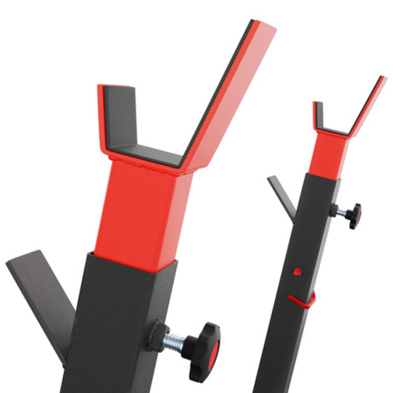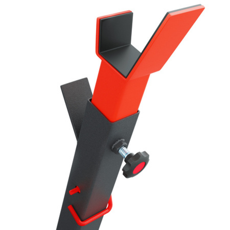 Стійки мають семиступінчасте регулювання висоти, замкові отвори розташовані з інтервалом 10 см, що дозволяє точно підлаштувати техніку під свій зріст. Встановивши підставку на потрібну висоту, ви можете зафіксувати підставку за допомогою натискного гвинта і стопорного стержня - це подвійна гарантія безпеки під час занять. Ми використали звукоізоляційний матеріал, який не тільки покликаний заглушити опускання штанги, але й запобігає її подряпинам.
