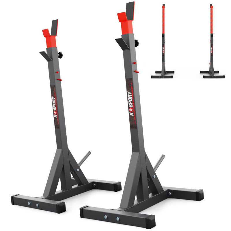 Наші стійки мають семирівневе регулювання висоти. Отвори для замків розмістили з інтервалом 10 см. Ви можете легко підлаштувати обладнання під свій зріст. Після встановлення на відповідній висоті зафіксуйте підставку за допомогою установочного гвинта та фіксуючої планки. Подвійна безпека - подвійна гарантія вашої безпеки! Також ми обладнали стійку для штанги спеціальним звукоізоляційним матеріалом. Це заспокоїть момент, коли ви кладете штангу, і не дасть їй подряпати. Посилені стійки для вправ зі штангою є необхідним обладнанням для кожного тренажерного залу. У пропозиції K-SPORT є все необхідне для комплектації обладнання для жиму ваги та роботи над силою м'язів!