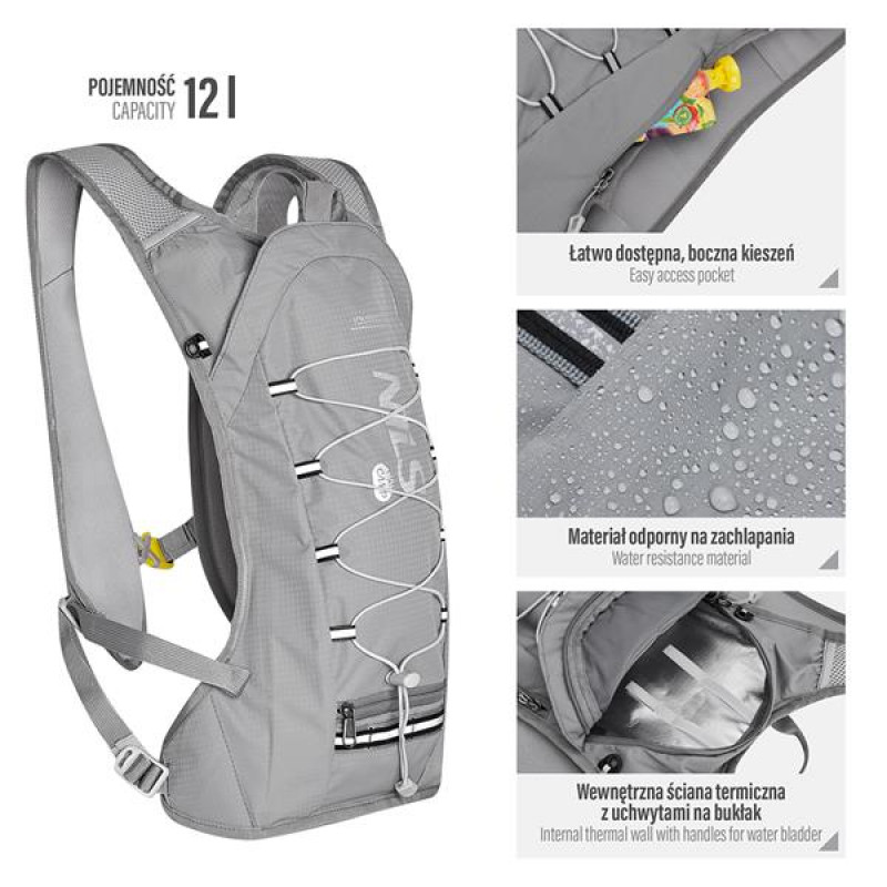 Специфікація: Матеріал: Нейлон Об'єм: 12л. Розміри: Висота: 43 см Ширина: 22 см Глибина: 8 см Вага: 350 г Водонепроникність: так Регульований нагрудний ремінь: 17 см Основне відділення з перегородкою для водяного міхура. Внутрішня задня термостінка. Кількість кишень на блискавці: 3 Свисток: так Вентиляція: Nils Vent System Примітки: Не для комерційного використання Гарантія 24 місяці