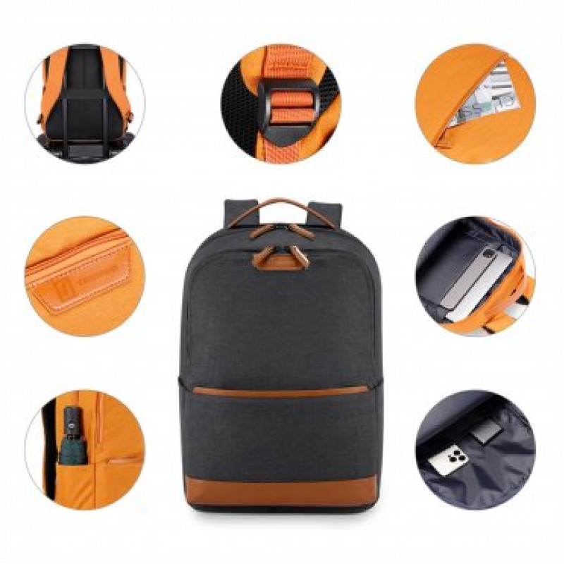 - У рюкзаку є: 1 велике відділення з подвійною блискавкою. Дві зовнішні бічні кишені (для парасольки або пляшечки). Усередині великого відділення передбачено відсік для ноутбука 15,6" (стінки відділення мають додаткове ущільнення для захисту лептопа від ударів) і відділ для планшета з діагоналлю екрана до 11". 2 внутрішні кишені для дрібних речей, смартфона або гаманця. 2 зовнішні кишені на блискавці.