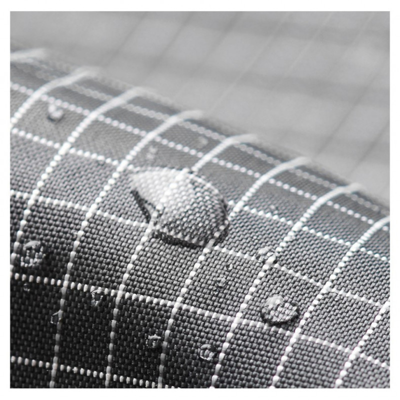 У пошитті використано синтетичну тканину, отриману з перероблених пластикових відходів. З внутрішньої сторони є підкладка з поліаміду. Сітчаста вставка в зоні спинки покращує циркуляцію повітря, щоб шкіра не випрівала під час тривалого носіння рюкзака.