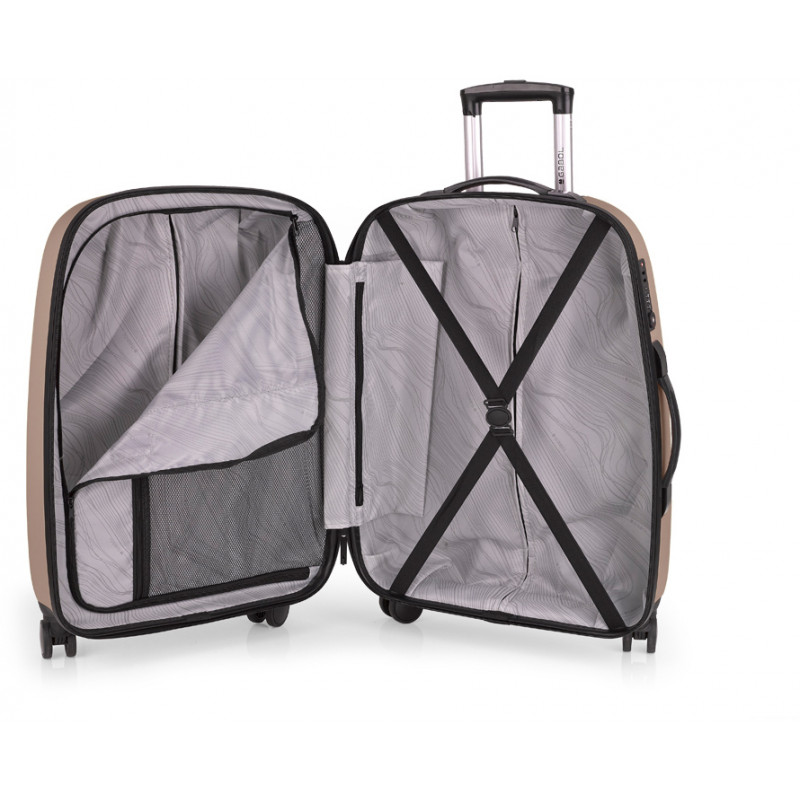 Корпус валіз Gabol серії Paradise XP виконаний з легкого та водночас міцного матеріалу ABS - термопластичний листовий конструкційний матеріал, який має підвищену ударостійкість і пружність, що дуже важливо для валіз які перевозяться в багажних відділеннях. Внутрішній простір розділений перегородкою на два відділення, яка має сітчасту кишеню на блискавці, додатково є кишеня для документів або різних дрібниць. Валіза обладнана розширювальним клапаном, який за необхідності дозволяє збільшити об'єм до 112 літрів.