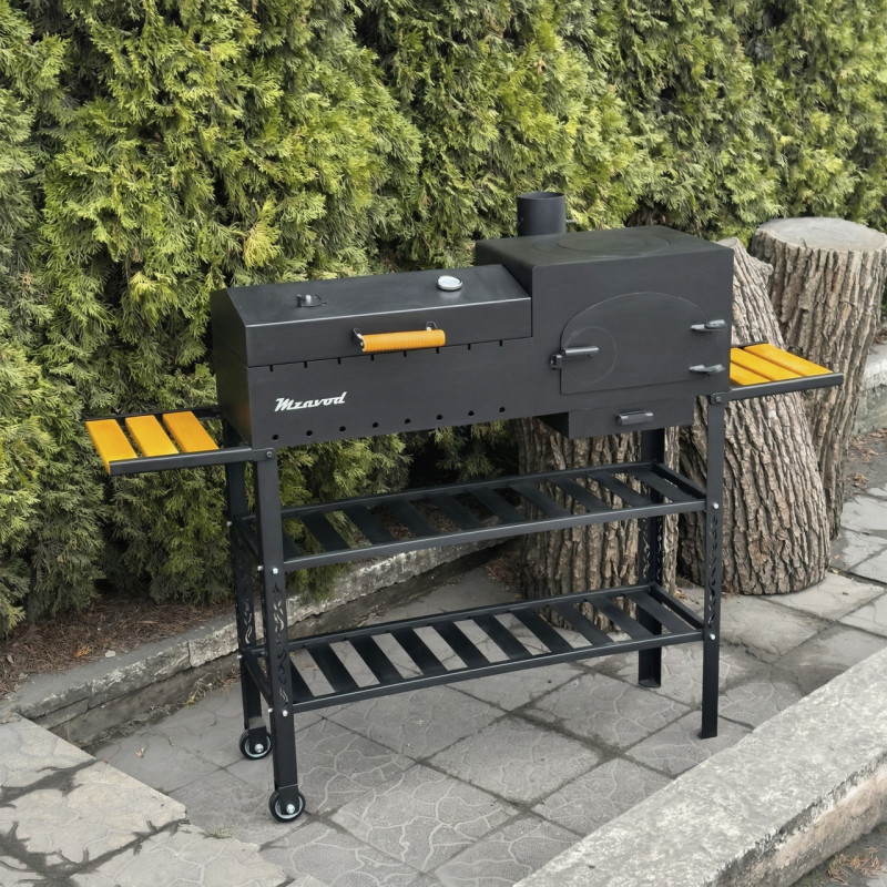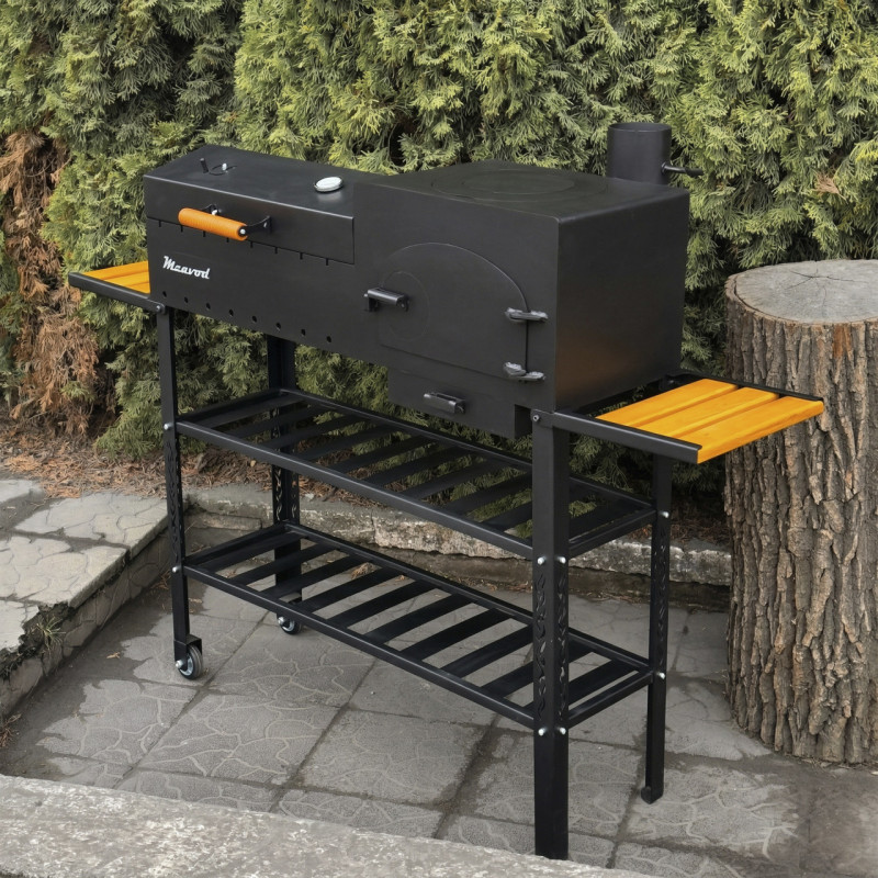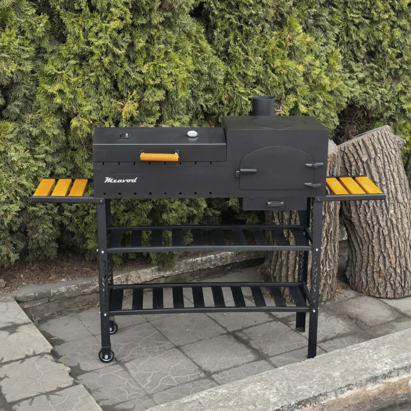 Містка полиця-дровниця дозволяє зручно зберігати запас дров або вугілля, забезпечуючи швидкий доступ під час приготування. Конструкція доповнена бічними полицями-ручками з дерев’яними вставками, які зручно використовувати для розміщення аксесуарів або продуктів. Завдяки наявності коліс, мангал легко переміщується по території.