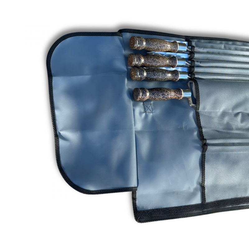 Набір поставляється в стильному чохлі з клапаном на липучці, виготовленому з матеріалу Оксфорд. Унікальна особливість цього чохла - його форма "конверта" в складеному стані, що забезпечує компактне зберігання всіх елементів набору. Цей чохол захищає шампури від факторів зовнішнього середовища та пошкоджень при транспортуванні. Чохол також захищає ваш одяг, речі та салон автомобіля від бруду, сажі та жиру, які можуть залишатися на приладді після приготування їжі. Клапан на липучці забезпечує надійне закривання чохла.