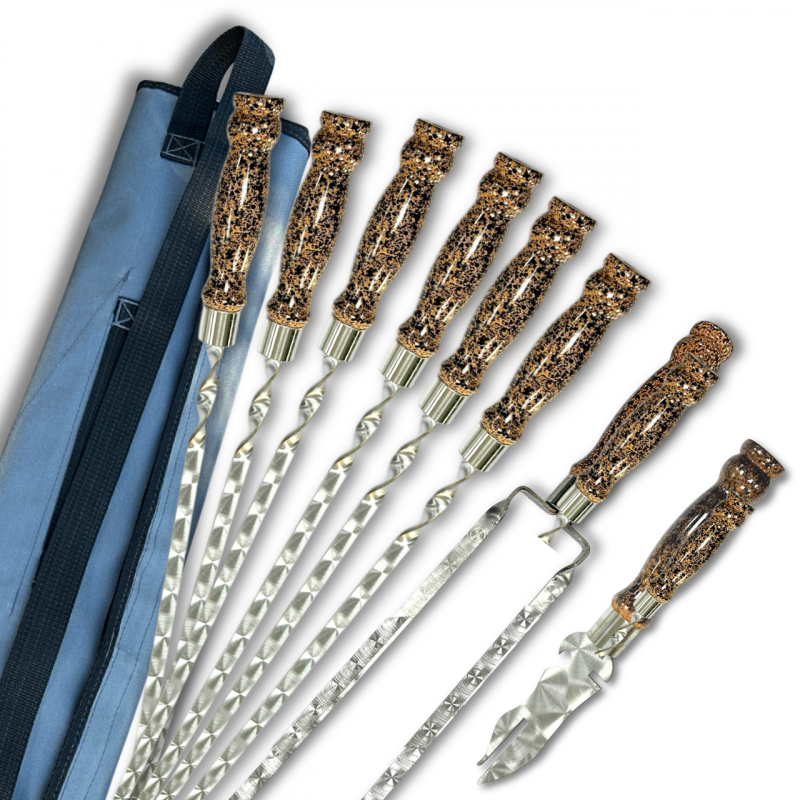 Лезо шампурів виготовлено з високоякісної харчової нержавіючої сталі AISI 430 (аналог 12Х17), забезпечуючи міцність та довговічність. Нержавіюча сталь гарантує, що шампури та вилка не тільки чудово витримують високу температуру, але й легко чистяться після використання, не втрачаючи свого блиску та бездоганного зовнішнього вигляду.