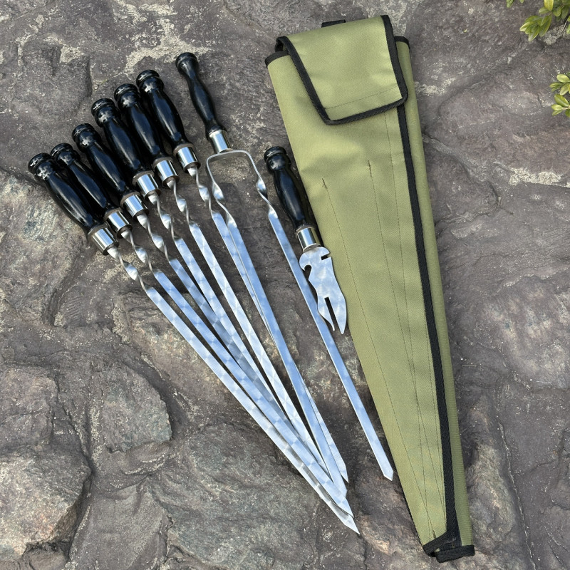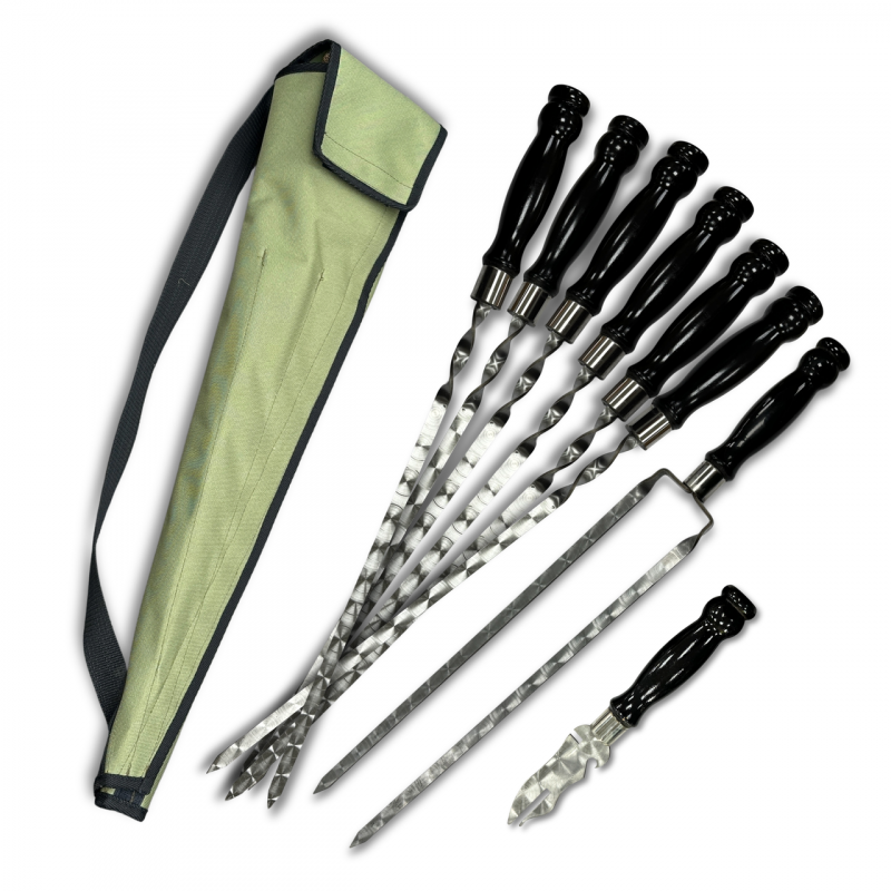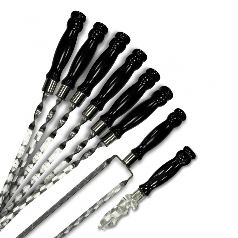 Лезо шампурів виготовлено з високоякісної харчової нержавіючої сталі AISI 430 (аналог 12Х17), забезпечуючи міцність та довговічність. Нержавіюча сталь гарантує, що шампури та вилка не тільки чудово витримують високу температуру, але й легко чистяться після використання, не втрачаючи свого блиску та бездоганного зовнішнього вигляду.