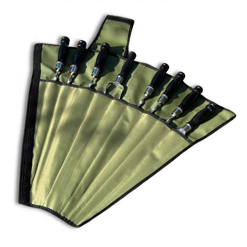 Набір поставляється в стильному чохлі з клапаном на липучці, виготовленому з матеріалу Оксфорд. Унікальна особливість цього чохла - його форма "віяла" в розкладеному стані, що забезпечує зручний доступ до всіх елементів набору. Цей чохол захищає шампури від факторів зовнішнього середовища та пошкоджень при транспортуванні. Чохол також захищає ваш одяг, речі та салон автомобіля від бруду, сажі та жиру, які можуть залишатися на приладді після приготування їжі. Клапан на липучці забезпечує надійне закривання чохла.