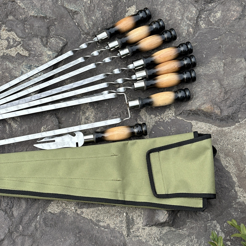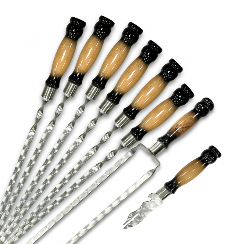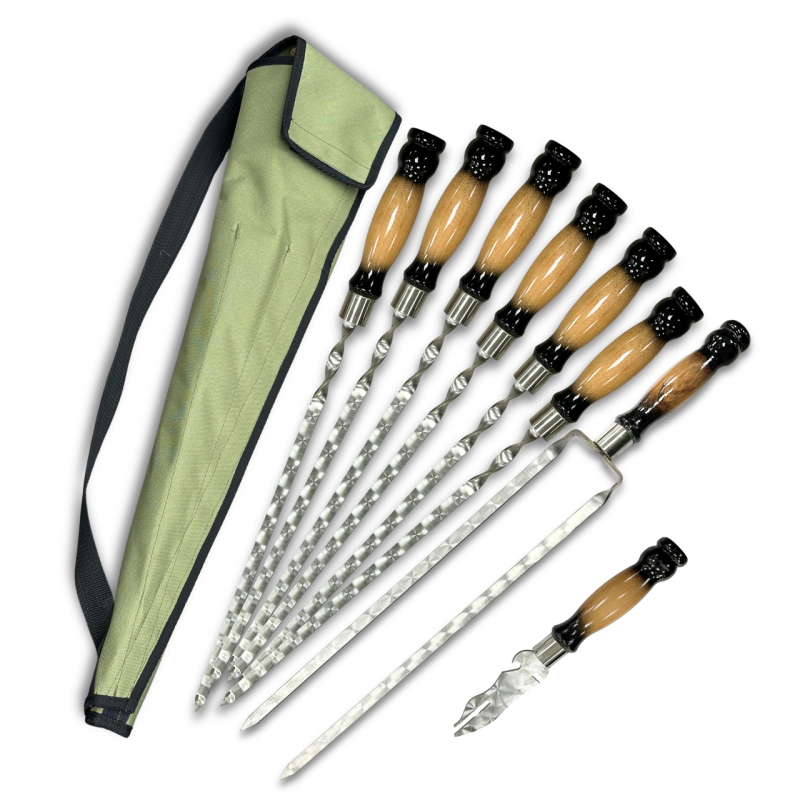 Лезо шампурів виготовлено з високоякісної харчової нержавіючої сталі AISI 430 (аналог 12Х17), забезпечуючи міцність та довговічність. Нержавіюча сталь гарантує, що шампури та вилка не тільки чудово витримують високу температуру, але й легко чистяться після використання, не втрачаючи свого блиску та бездоганного зовнішнього вигляду.