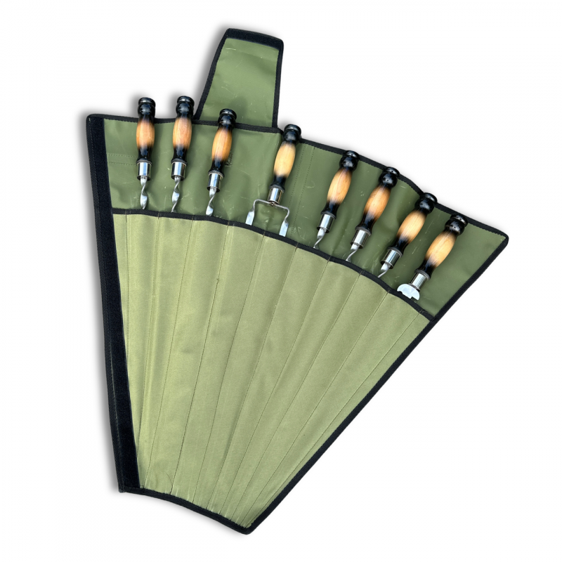 Набір поставляється в стильному чохлі з клапаном на липучці, виготовленому з матеріалу Оксфорд. Унікальна особливість цього чохла - його форма "віяла" в розкладеному стані, що забезпечує зручний доступ до всіх елементів набору. Цей чохол захищає шампури від факторів зовнішнього середовища та пошкоджень при транспортуванні. Чохол також захищає ваш одяг, речі та салон автомобіля від бруду, сажі та жиру, які можуть залишатися на приладді після приготування їжі. Клапан на липучці забезпечує надійне закривання чохла.