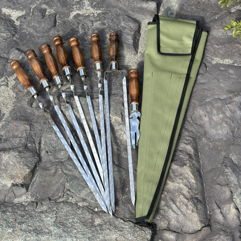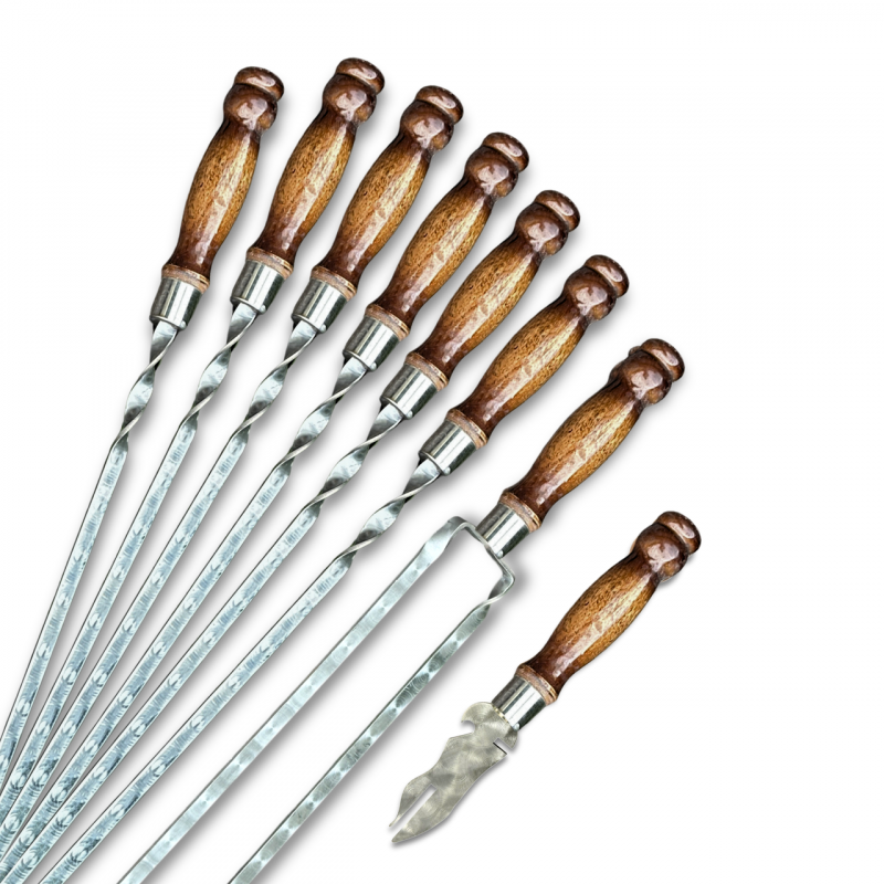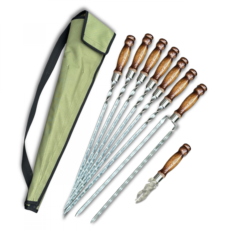 Лезо шампурів виготовлено з високоякісної харчової нержавіючої сталі AISI 430 (аналог 12Х17), забезпечуючи міцність та довговічність. Нержавіюча сталь гарантує, що шампури та вилка не тільки чудово витримують високу температуру, але й легко чистяться після використання, не втрачаючи свого блиску та бездоганного зовнішнього вигляду.