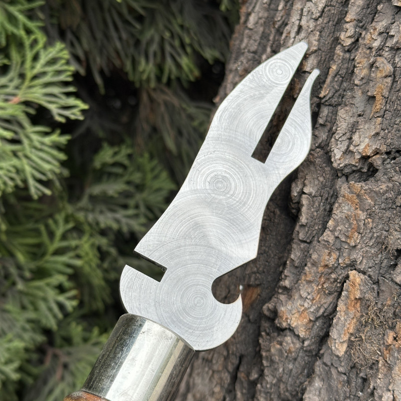 Вилка має два зубці на кінці, які допомагають утримувати м'ясо на шампурі, запобігаючи його ковзанню або падінню під час перевертання або зняття з шампура.