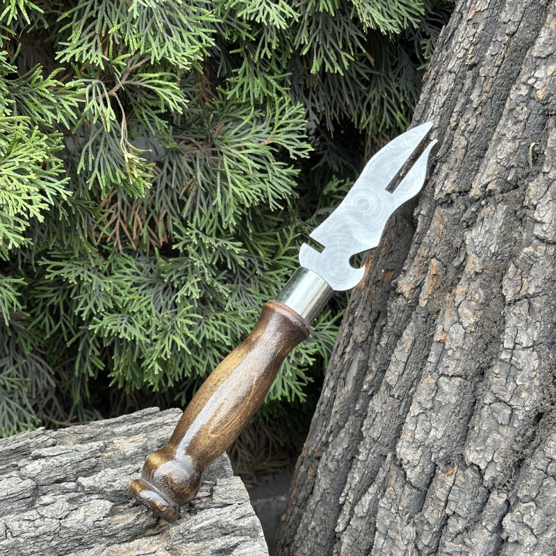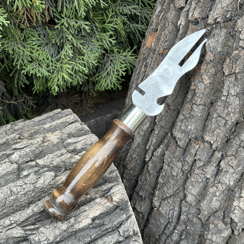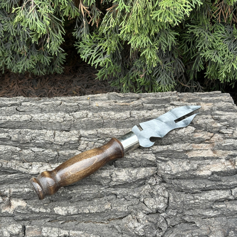 Вилка з дерев'яною ручкою для зняття м'яса з шампура, виготовлена з нержавіючої сталі, призначена для зручного та безпечного поводження з м'ясом на шампурах при готуванні на грилі або багатті.