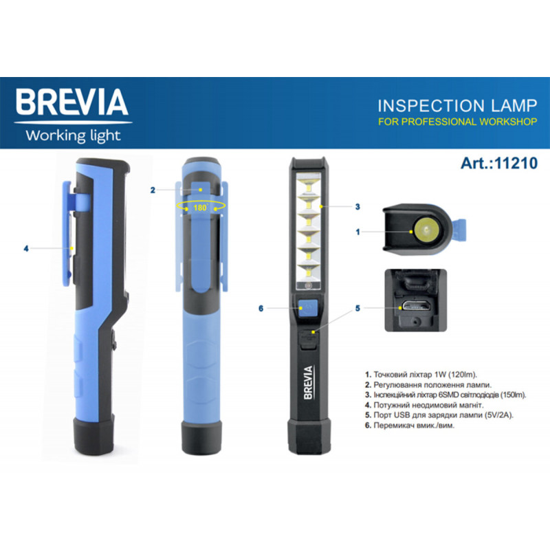 Це дозволяє використовувати ліхтарик в екстремальних умовах. Він зручно фіксується, і відмінно освітить потрібний простір. Ліхтар Brevia LED Pen Light 6SMD 1W LED, 150lm, 900mAh, microUSB 11210 призначений для виконання вузькопрофільних і стандартних побутових завдань. Ідеально підходить для роботи в майстерні або вдома. Може використовуватися для освітлення запчастин у вузьких отворах або для освітлення дороги. Має багато переваг. Харчування від світлодіода. Це гарантує довгий термін служби. Крім того, світлодіод споживає мінімальну кількість енергії, що дозволяє використовувати освітлення протягом тривалого часу без необхідності заміни батарей. Ліхтарик харчується від літій-іонного акумулятора. Завдяки цьому довго тримає заряд, швидко відновлює роботу. Зручний і функціональний, він стане відмінним помічником у вашій роботі. Вироби виготовлені з високоякісного пластику, який витримує навантаження і легко чиститься. Ліхтарик має привабливий дизайн.