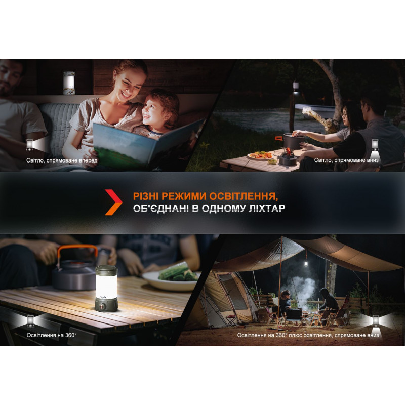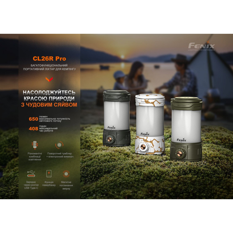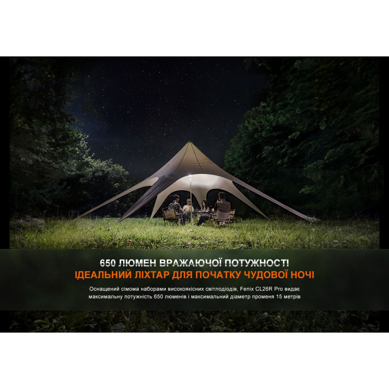 Ліхтар Fenix CL26R Pro — функціональний супутник під час відпочинку на природі. Варіативність використання моделі дозволяє облаштувати місце для відпочинку на основі особистих потреб та уподобань: ліхтар здатний світити як на 360°, так і лише вниз, а червоне світіння перетворює його на нічник, що дозволяє мандрівнику розслабитися перед відходом до сну.