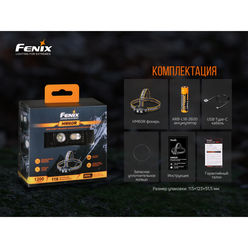 Ліхтар моделі Fenix HM60R, акумулятор Fenix ARB-L18-3400 Li-ion, кабель для зарядки USB Type-C, запасне кільце ущільнювача, керівництво користувача, талон гарантії.