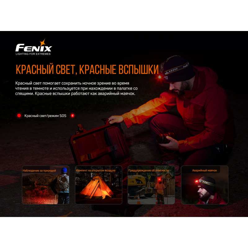Дальнє світло, ближнє світло і червоне світло об'єднуються. Компанія Fenix піклується про те, щоб випускати якомога більш передові ліхтарі, тому безперервно покращує їх і виробляє вдосконалені моделі. Новою характеристикою в цьому приладі є сенсор частоти кроку: яскравість ліхтаря залежить від швидкості руху людини. Налобна модель Fenix HM60R створена для максимальної зручності користувачів.