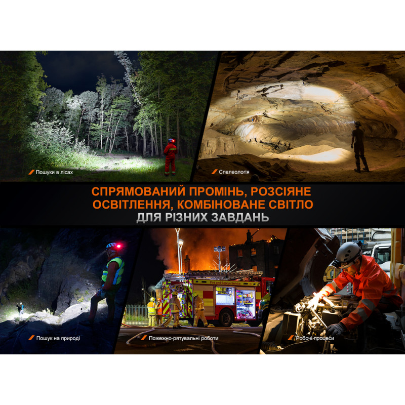 - налобний ліхтар для пошуково-рятувальних робіт, патрулювання, спелеології, пожежогасіння;