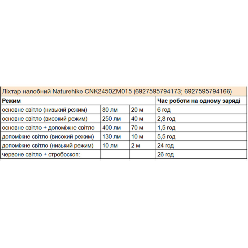 - 4 основні режими. Параметри білих режимів: 400 лм/1.5 год, 250 лм/2.8 год, 130 лм/5.5 год. У червоному режимі ліхтар працює протягом 26 год на одному заряді.