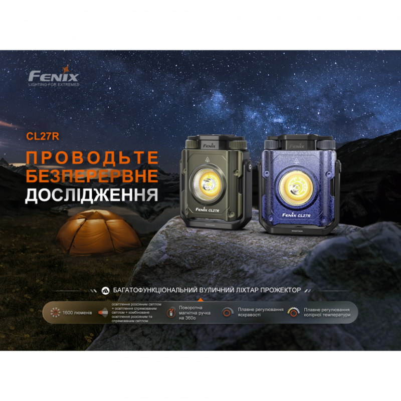 Наявність 10 режимів роботи яскравістю до 1600 лм з можливістю плавного регулювання колірної температури світла робить ліхтар Fenix CL27R одним із найфункціональніших в асортименті бренду. Модель можна використовувати для різних цілей: для освітлення вдома або в кемпінгу, для виконання промислових робіт і навіть для відеозйомок. Останній факт було перевірено під час тестування ліхтаря українськими відеоблогерами, які гідно оцінили різноманітність та якість освітлення, що легко налаштовується під певні потреби.