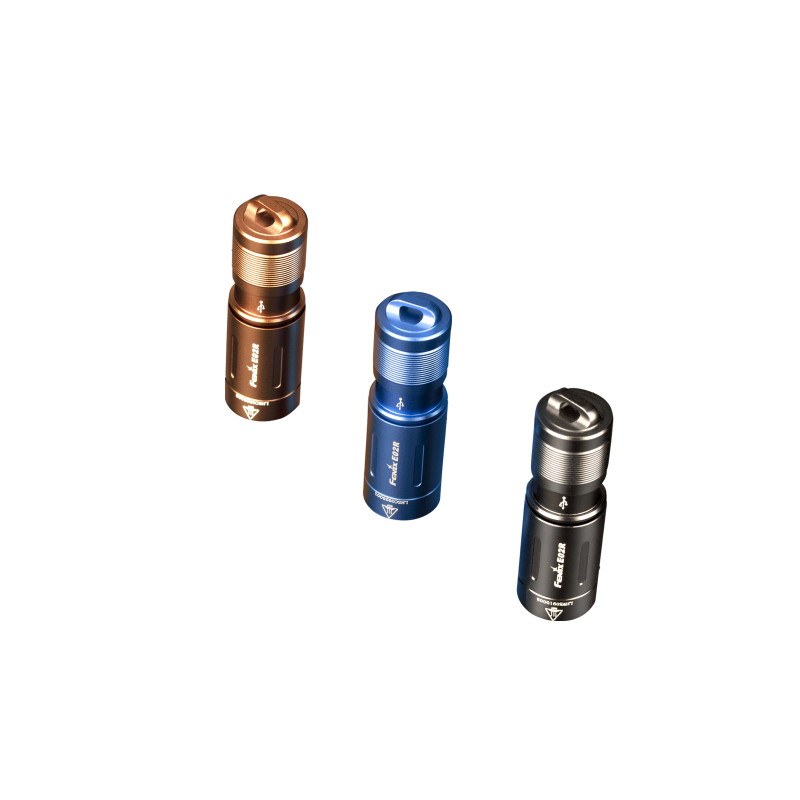 Ліхтар оснащується лінзою з дзеркальним напиленням, що гарантує високу ефективність освітлення. Fenix E02R виготовлений з міцного матеріалу, яким є алюміній марки А6061-Т6. Він користувачам пропонується в трьох різних дизайнах. Є на вибір варіанти з чорним, синім, бронзовим кольорами корпусу.