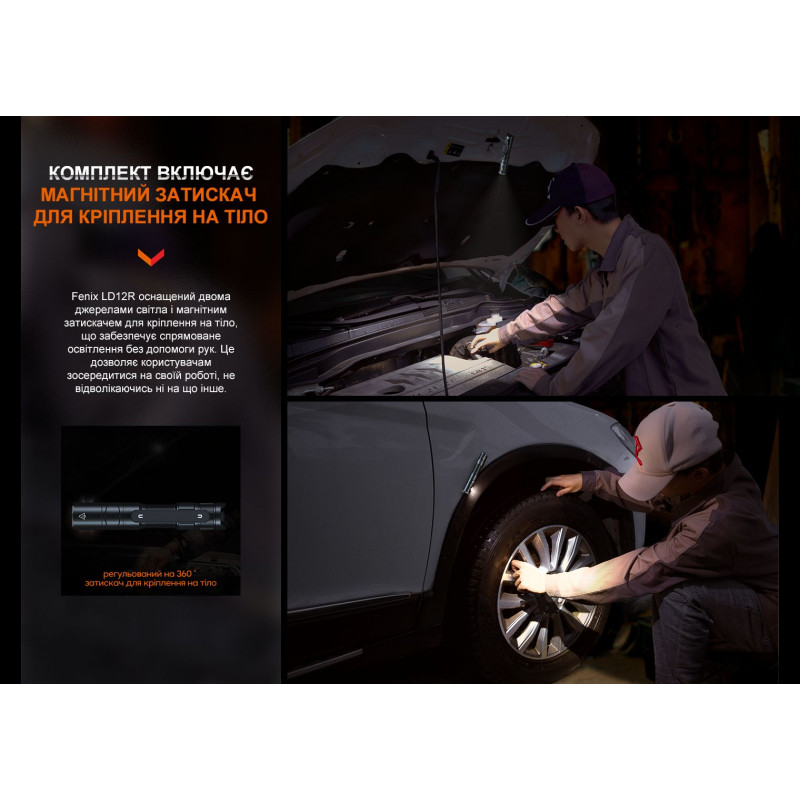 Ліхтар типу EDC, Fenix LD12R, — це мініатюрний помічник в освітленні закритого приміщення або невеликого відкритого простору під час відпочинку на природі. Функціональність моделі забезпечують два світлодіоди, розміщені з різних боків корпусу: основний Luminus SST20 з колірною температурою 6500К та бічний SC1818C. Термін служби обох діодів становить щонайменше 50 тисяч годин.