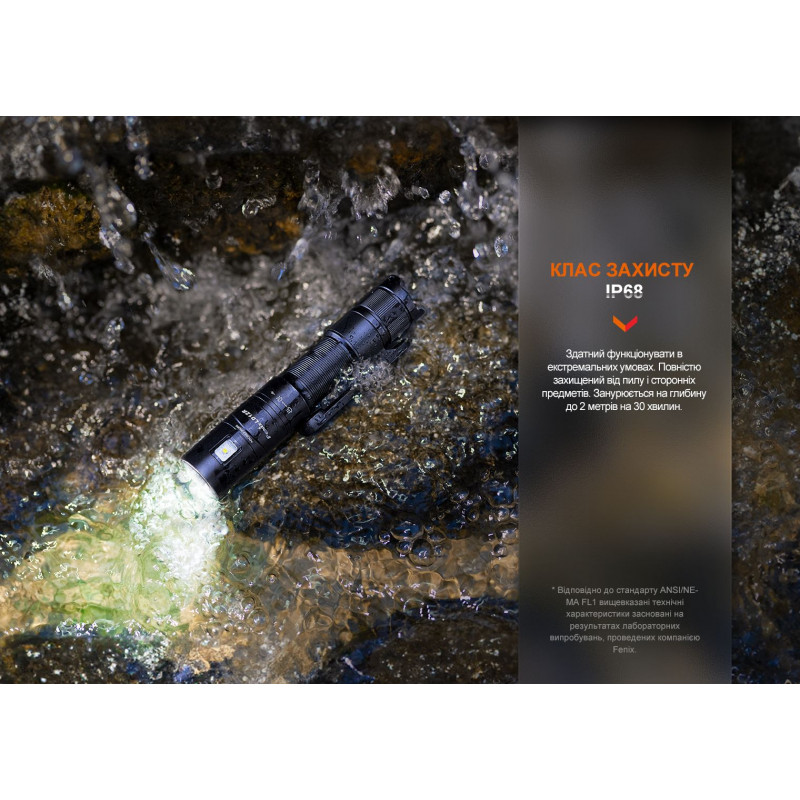 Рівень гідроізоляції корпусу — IP68, тому ліхтар продовжує працювати навіть після занурення на глибину 2 метри протягом 30 хвилин.