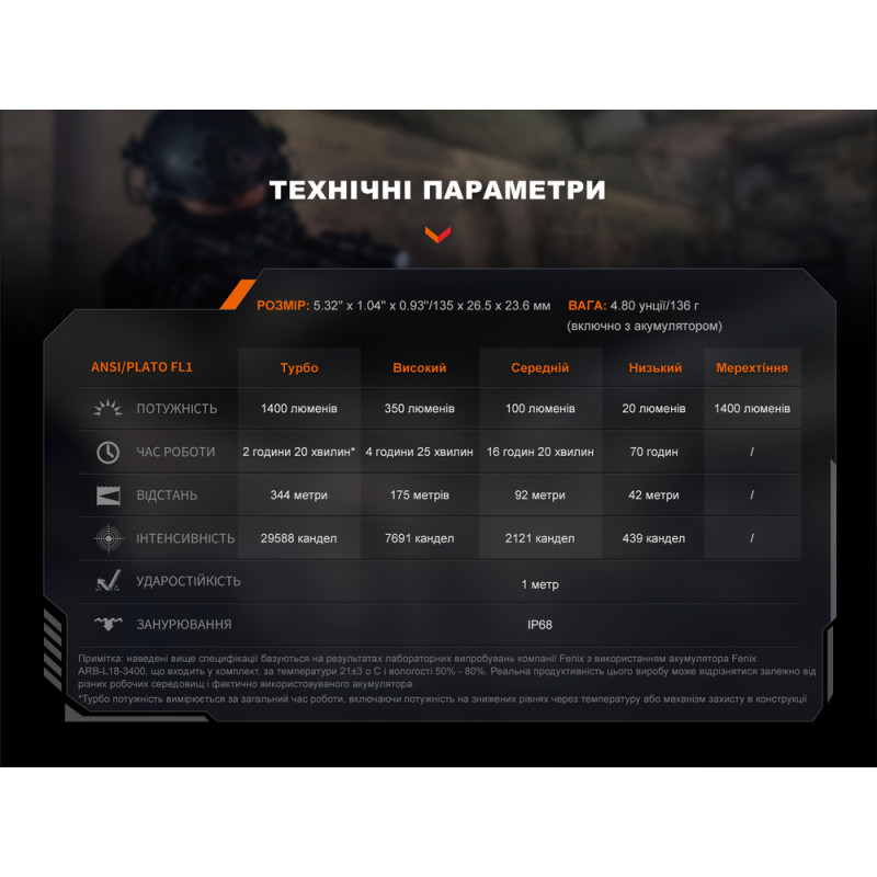 - Турбо: 1400 лм – 29 588 кд – 2 год 20 хв – 344 м;