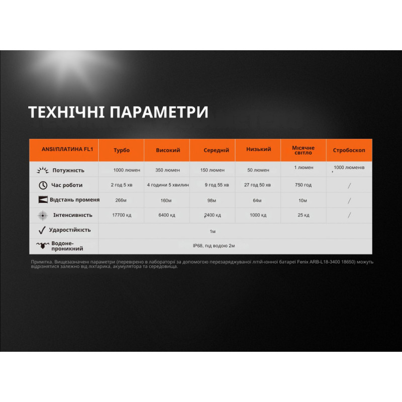 У цьому ліхтарі встановлений світлодіод Cree XP-L HI V3, який здатний працювати з яскравістю до 1 000 люмен, забезпечуючи при цьому створення спрямованого світлового потоку з дальністю до 266 метрів.