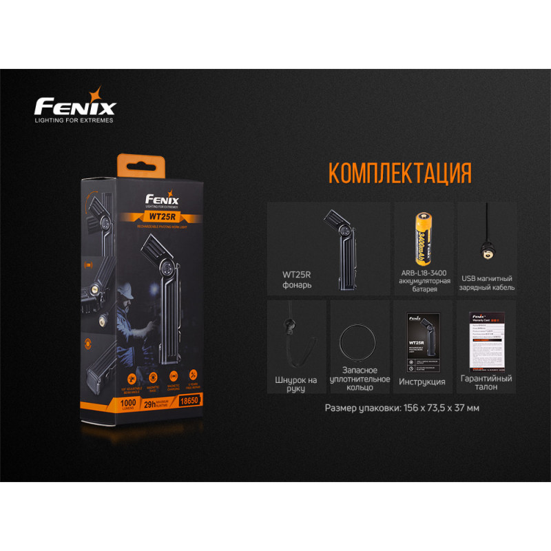 Модель ліхтаря Fenix WT25R, акумулятор ARB-L18-3400 Li-ion, Магнітний USB-кабель для зарядки, кільце для підвішування, ремінець, запасне кільце ущільнювача, пам'ятка, інформаційна листівка, керівництво до застосування, талон гарантії.