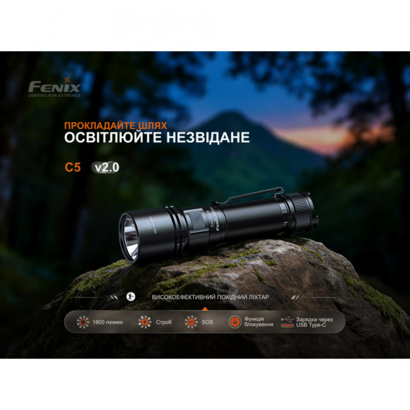 Fenix C5 V2.0 — це друге покоління популярної моделі, що отримало значне підвищення продуктивності при збереженні оптимальних габаритів. Ліхтар розроблений як надійний джерело світла для активного відпочинку, патрулювання та вирішення побутових завдань, де потрібна висока яскравість та витривалість.