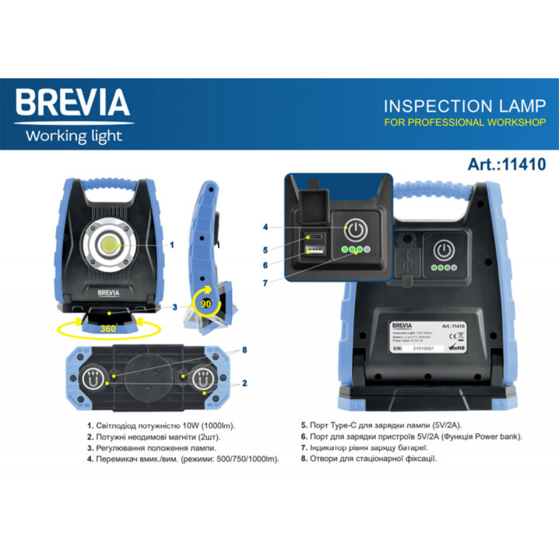 Професійна інспекційна лампа Brevia LED 10W COB 1000lm 4400mAh Power Bank, type-C