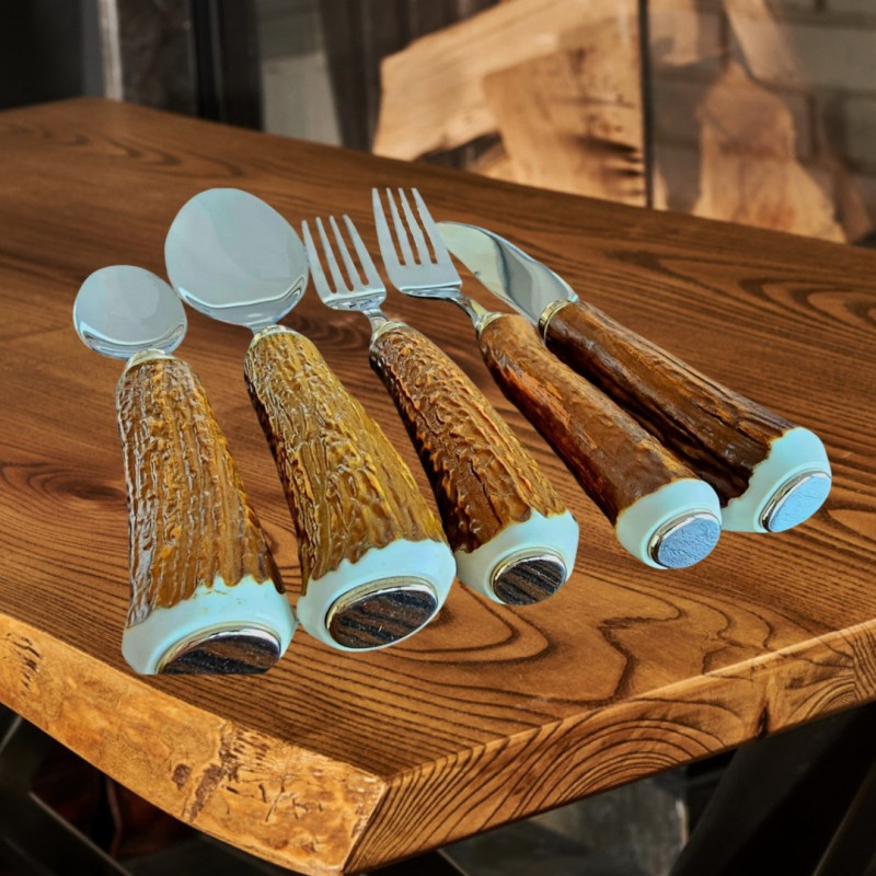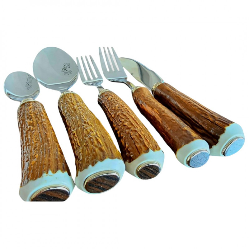 Особливу увагу привертають рукоятки у формі імітації рогів із полістоуну з мікронним напиленням золота. Такий дизайн додає набору благородства та підкреслює його характерний мисливський стиль.