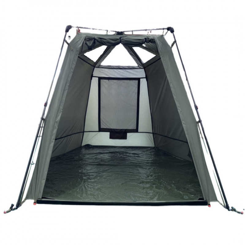 Міцна водонепроникна підлога кріпиться по периметру на блискавці, що робить її встановлення швидким та зручним. За потреби підлогу можна частково або повністю зняти. Просторий внутрішній об’єм дозволяє перебувати всередині у повний зріст, а підняті двері у вигляді козирка створюють велику затінену зону. Під таким навісом можна комфортно розташувати крісло, стіл та спорядження, захистившись від сонця навіть у спекотний день. Намет компактно складається в зручну сумку для транспортування.