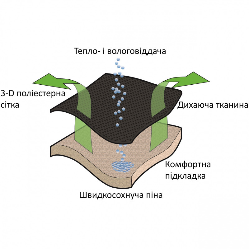 - Швидковисихаюча, дихаюча тканина з комфортною подушкою.
