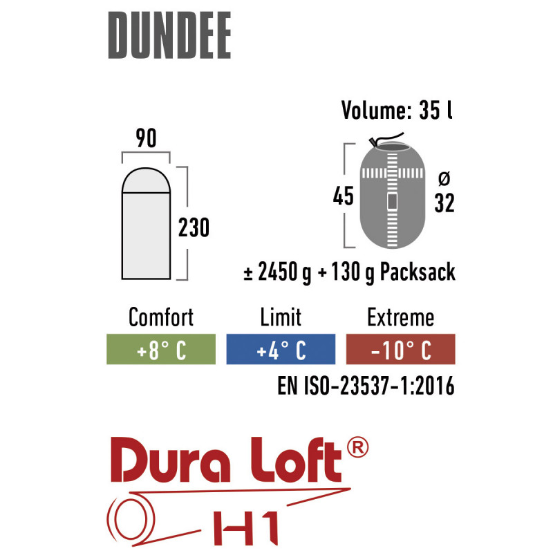 High Peak Dundee 4/+4°C Grey/Light Grey Left (21238) - спальний мішок, виконаний у формі ковдри з компресійним чохлом у комплекті. Зовнішня оболонка та внутрішня підкладка виконані з найтоншої тканини, що складається з 65% поліестеру та 35% бавовни. Спальний мішок має високоякісний наповнювач Dura Loft® H1 з чудовими ізоляційними властивостями. Матеріал Dura Loft® H1 легко стискається, довговічний, зберігає тепло навіть у вологих умовах, швидко сохне. Спальний мішок High Peak Dundee 4/+4°C Grey/Light Grey Left (21238) оснащений регульованим капюшоном, внутрішнею кишенею для зберігання цінних речей і довгою двосторонньою блискавкою. Це дозволяє відкрити нижню частину спальника в теплі ночі. Блискавка закрита вітрозахисною перегородкою, застібка має ергономічну форму для зручного хвату рукою. Спальний мішок розрахований на зріст користувача до 210 см, призначений для відпочинку в кемпінгу.