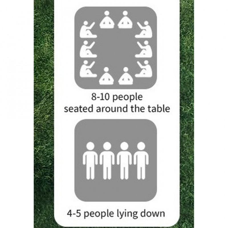 Матеріали не містять формальдегіду та є гіпоалергенними. Розміри килимка становлять 210 х 240 см, що робить його ідеальним для відпочинку 5-10 осіб. Прошиті краї запобігають зношуванню та розшаруванню матеріалу.