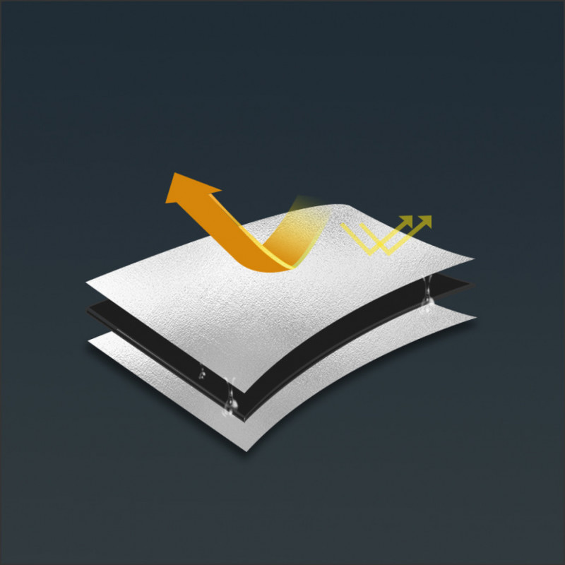 - Багатошаровий матеріал. Килимок виконаний з комбінованого матеріалу PE з алюмінієвою плівкою, що утворює тришарову структуру. Шар із алюмінію працює як відбивач, який знижує тепловтрати, створює бар'єр між тілом та холодною землею, відштовхує вологу та допомагає довше зберігати комфортну температуру. PE відповідає за теплоізоляцію та м'якість.