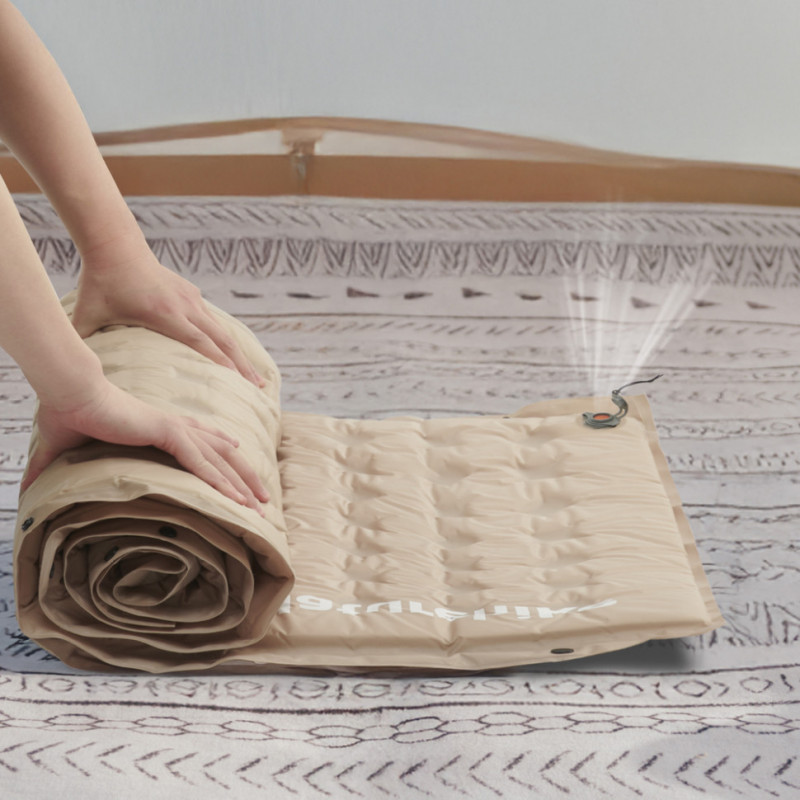 - Швидке надування без зайвих зусиль. Килимок має вбудований клапан для самонадування: достатньо відкрити його, щоб килимок почав самостійно наповнюватися повітрям приблизно на 70%. За бажання можна трохи підкачати повітря для більшої пружності — вручну або за допомогою помпи.