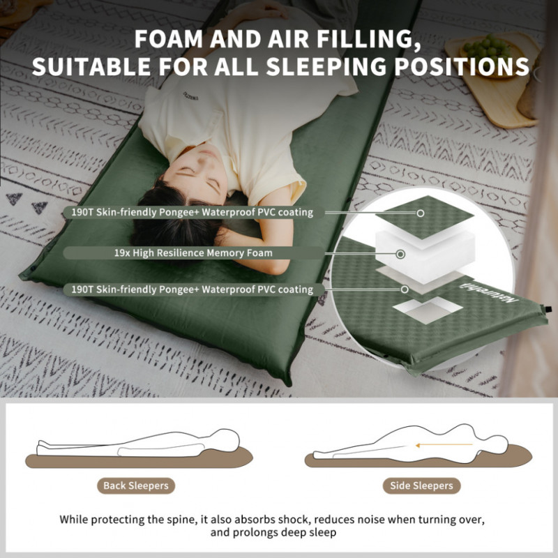 Верхній шар виготовлений з гладкого епонжу 190T із пінним наповнювачем. Ключова перевага килимка — ортопедичні властивості, завдяки яким він рівномірно розподіляє вагу тіла, підтримуючи хребет у правильному положенні та знижуючи навантаження на суглоби та м'язи під час сну.